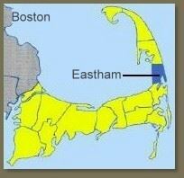 The Town of Eastham is a coastal resort community straddling the arm of Cape Cod. Located on the lower Cape, the town is bounded on two sides by land, Orleans and Wellfleet, the other two by water, the Atlantic Ocean and Cape Cod Bay. Pre-colonial stands of oak and pine were long ago harvested for fuel and shipbuilding and the terrain of the town is now heavily salt marsh and sand.
